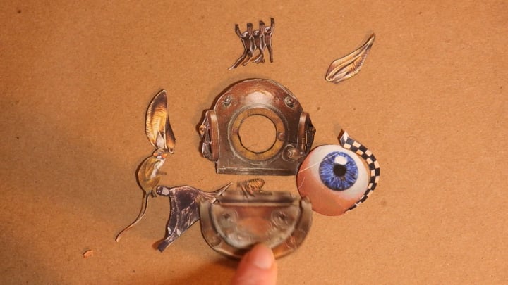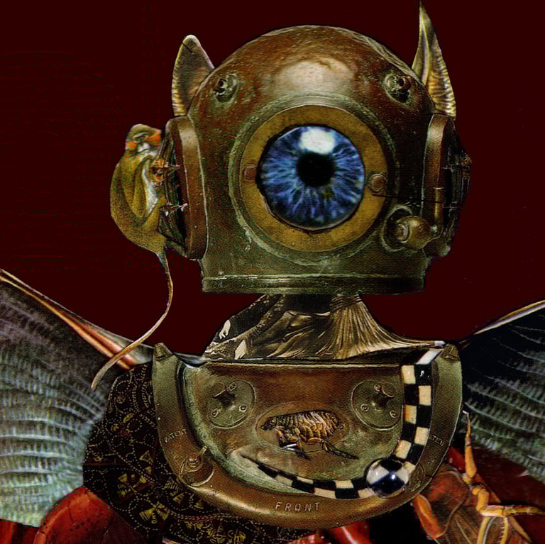 I began by sourcing and carefully selecting vintage illustrations, anatomical fragments, mechanical details, and tiny creature motifs, then hand-cut each element with precision scissors to isolate their forms. Piece by piece, I layered and assembled them—fusing the brass diver’s helmet eye with pulsing red heart tissue, bat wings adorned with crawling turtles, and dangling insect-limbed roots—into a singular, hybrid sentinel suspended in deep crimson shadow, evoking raw confrontation with the divine.