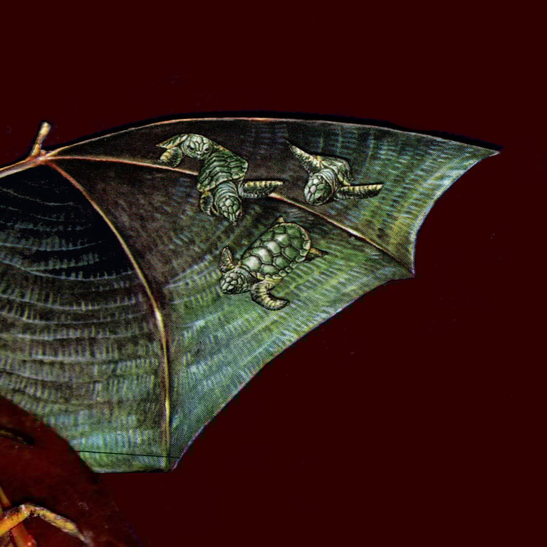 Hand-cut and painstakingly assembled from layered fragments of the visceral and the mechanical, this collage births a hybrid sentinel: a bat-winged diver’s helmet crowned with a vast, unblinking blue eye, perched atop a throbbing crimson heart-cavity. Brass fittings gleam against raw flesh, tiny turtles crawl the membrane wings, insects and roots spider outward like veins of quiet rebellion. A baroque chest-plate etched with beasts and checkerboard holds the center, while dangling limbs—part organic, part relic—reach into shadow. The whole figure floats in deep maroon void, fragile yet defiant, a tender automaton confronting its maker: raw surrender stitched with luminous unease.