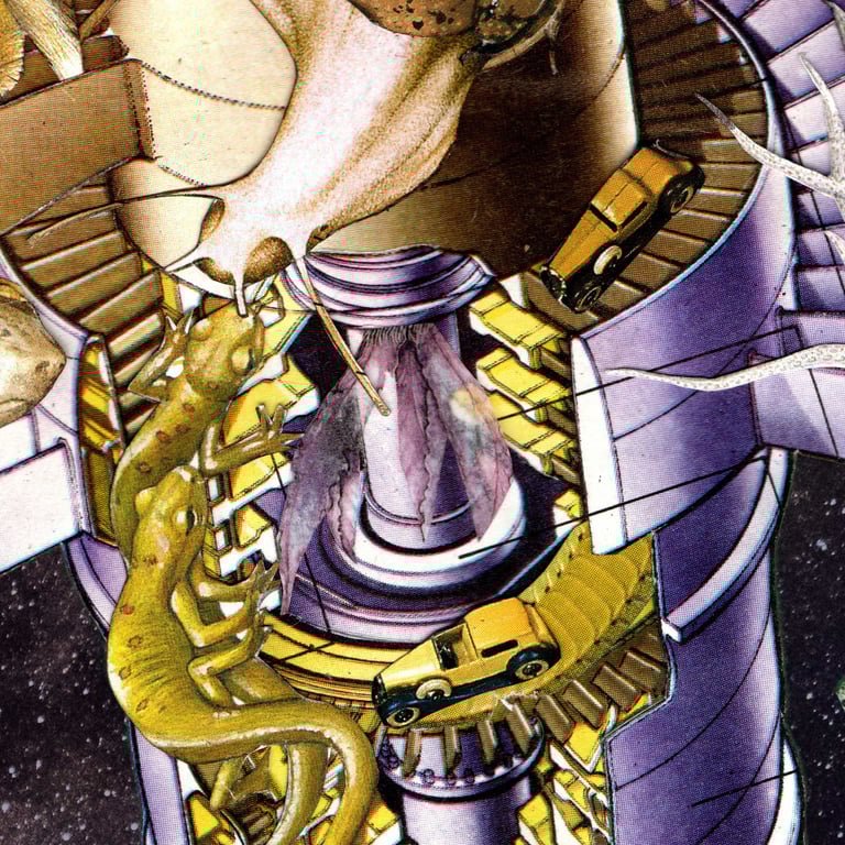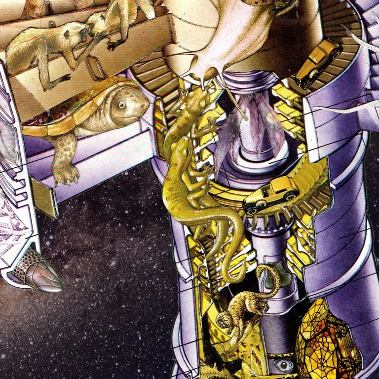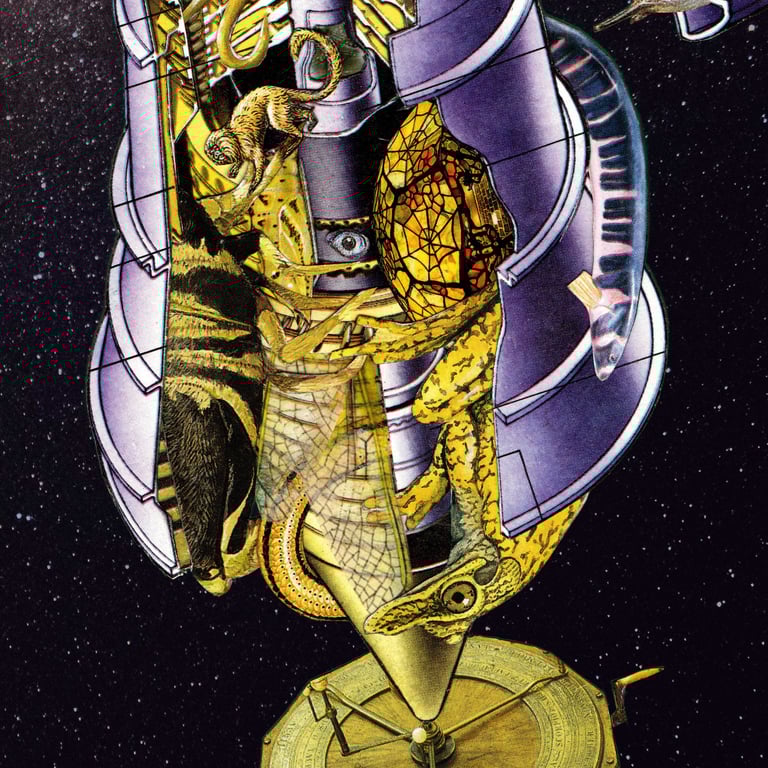I sit at my table surrounded by scattered pages from old natural history books, aviation manuals, and yellowed technical diagrams—fragments of Bristol’s industrial past and the wild pulse of life itself. With precision scissors in hand, I begin the slow, deliberate cut: each reptile’s scale, each serpent’s coil, every gear tooth and piston curve freed one by one from its original context. There is no rush; the act is meditative, almost ritualistic. I trace the edges until the paper yields, isolating forms that once belonged to separate worlds—zoological plates meeting Rolls-Royce engine schematics, fish gliding across hexagonal bases, turtles nesting in segmented chambers. Layer by layer I build, gluing with the lightest touch so the seams remain visible, a quiet reminder that this is not seamless fusion but chosen assembly. The process demands patience and reverence: every cut is a decision, every placement a conversation between the mechanical and the organic, between the cold precision of Bristol’s aero-engine heritage and the teeming, untamed minds of creatures that have never known blueprints.