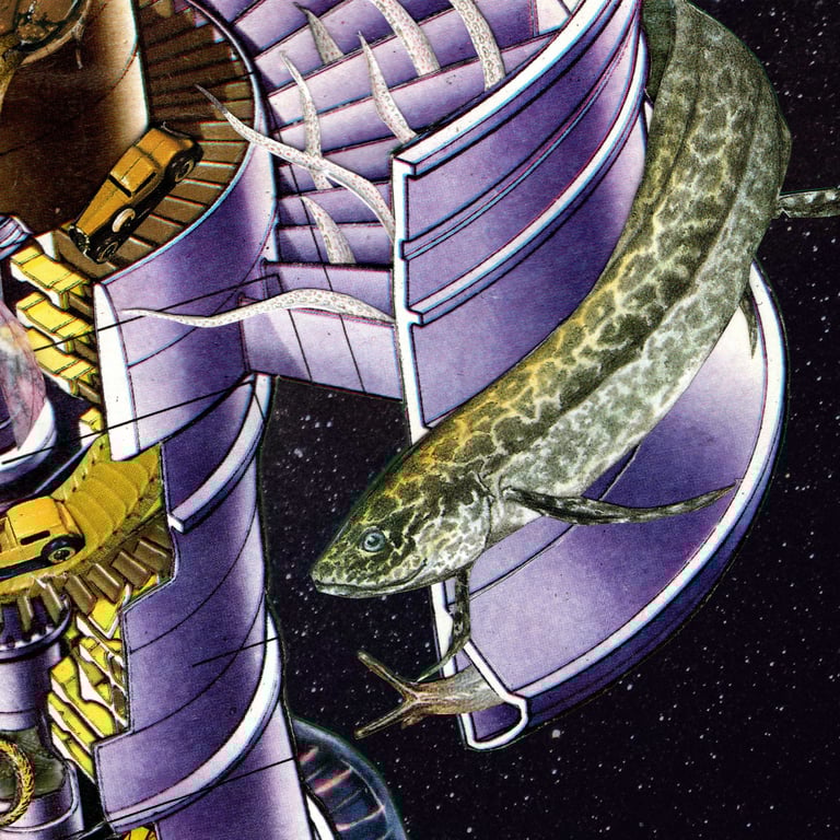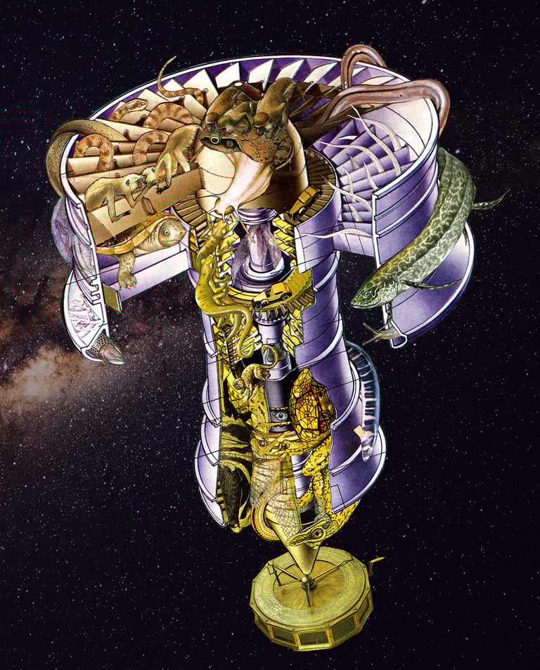 In the finished piece, that towering purple-and-gold spiral becomes more than an engine—it is a symbol of convergence, a cosmic ark where other minds meet. The Rolls-Royce form at its core nods to Bristol’s legacy of human ingenuity reaching for the sky, yet I’ve filled its chambers with lizards, snakes, monkeys, eels, and fish, as though the machine has awakened and invited every living intelligence aboard.